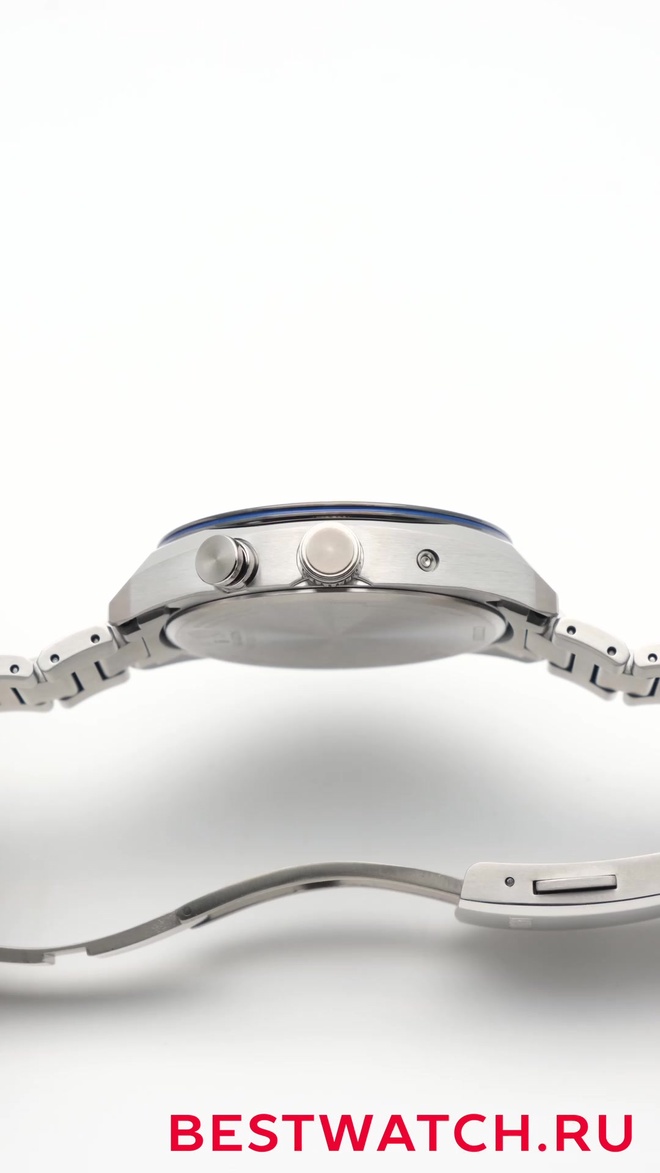 Синий циферблат с штриховыми индексами для четкого считывания времени и даты. Титановый браслет подчеркивает современный облик и комфорт.