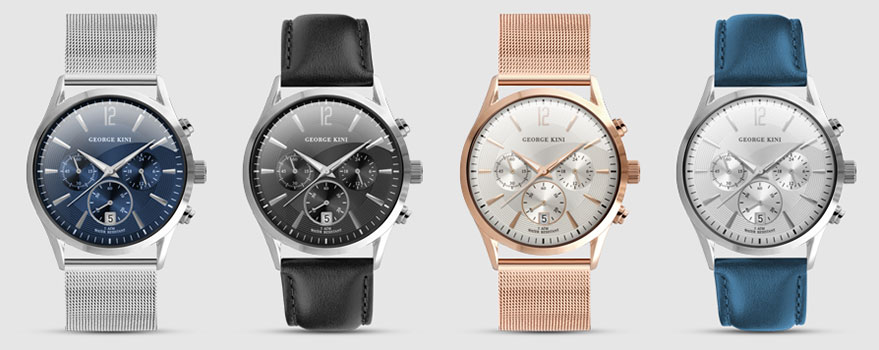 Еще одна «фишка» George Kini – подбор цветов. Коллекция включает всего два корпуса и несколько рисунков циферблата, зато огромное число цветовых решений. Привлекательными для покупателей являются «натуральные», природные краски: темно-зеленые, темно-синие, шоколадные. Палитра подобрана очень тщательно, благодаря чему эти часы подойдут к любому гардеробу.